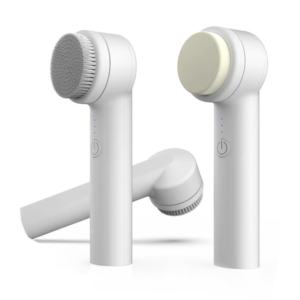 3-in-1 facial cleansing brush with 3 speed levels, 750mAh lithium battery, 1.5 hours runtime, IPX7 waterproof, visible intensity display, and stand design. Gentle deep cleansing, forward/reverse rotation, and intelligent timing for effective skincare.