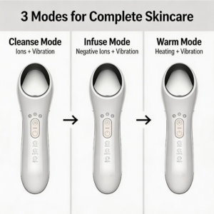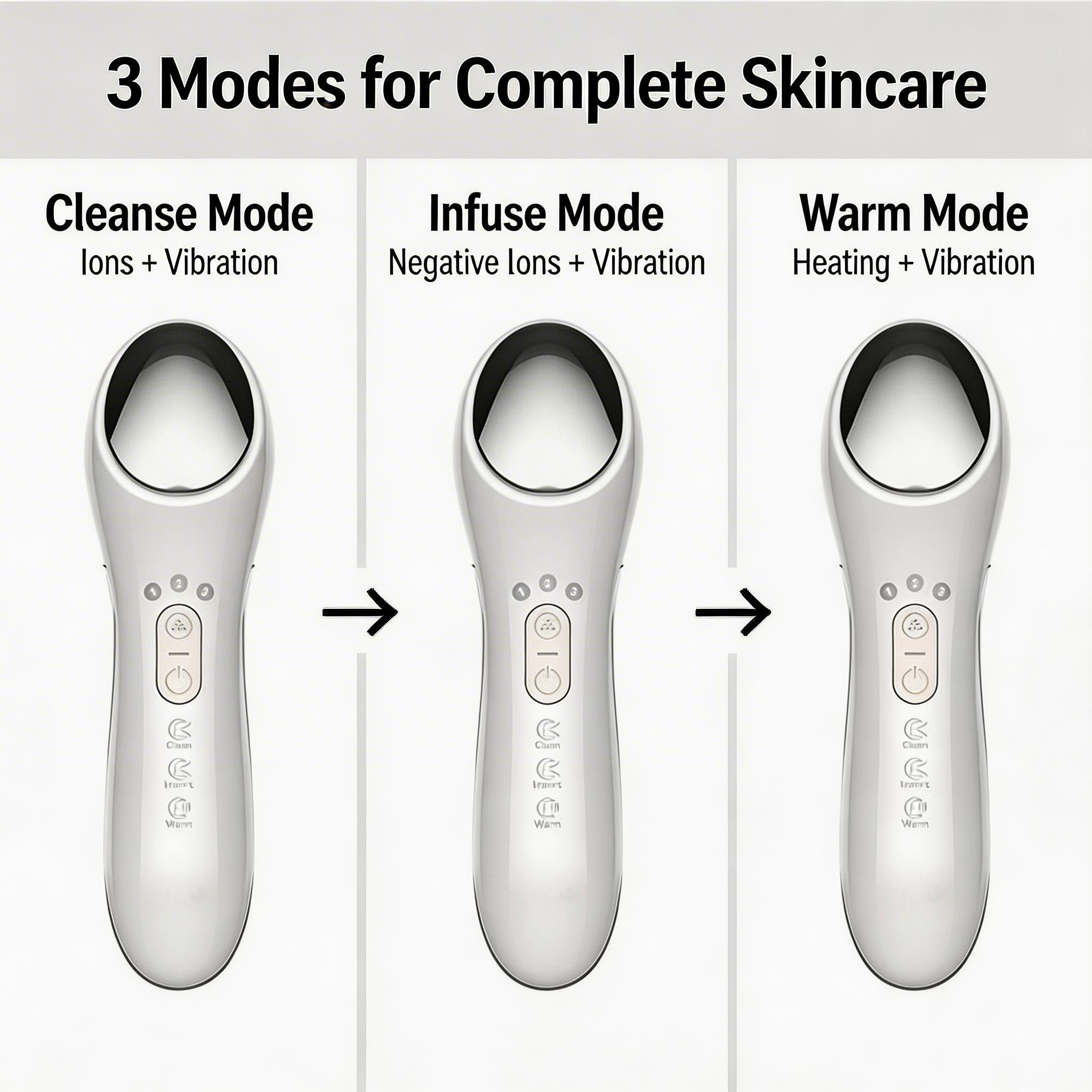 Multi-functional facial beauty device with 3 modes (Cleansing/Import/Warm), 3 adjustable intensity levels per mode, 420mAh USB-rechargeable battery, auto-shutoff, and 39-45°C heating. Ideal for deep cleansing, skincare absorption, and facial warming.